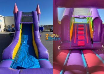 3 Monkeys Inflatables offers a unique rental with this Dream Castle Combo. This combo offers a large, open bounce area where the kiddos will have a blast jumping, bouncing, giggling, and playing basketball! Then they can climb their way to the top of the slide and make their way down the thrilling waterslide! You are probably wondering what makes this unit so unique? This is our only unit that has the capability of having water spray inside the bounce area! AND it is designed with a non-slip floor material to make for safer, wet bouncing! This unit is loved by all parents and kiddos who have had this unit. Most other Combos that are used wet do not offer the wet option in the bounce house area, this is a big deal and the reason the Dream Castle Combo is quickly becoming one of our most popular wet/dry combos every summer!